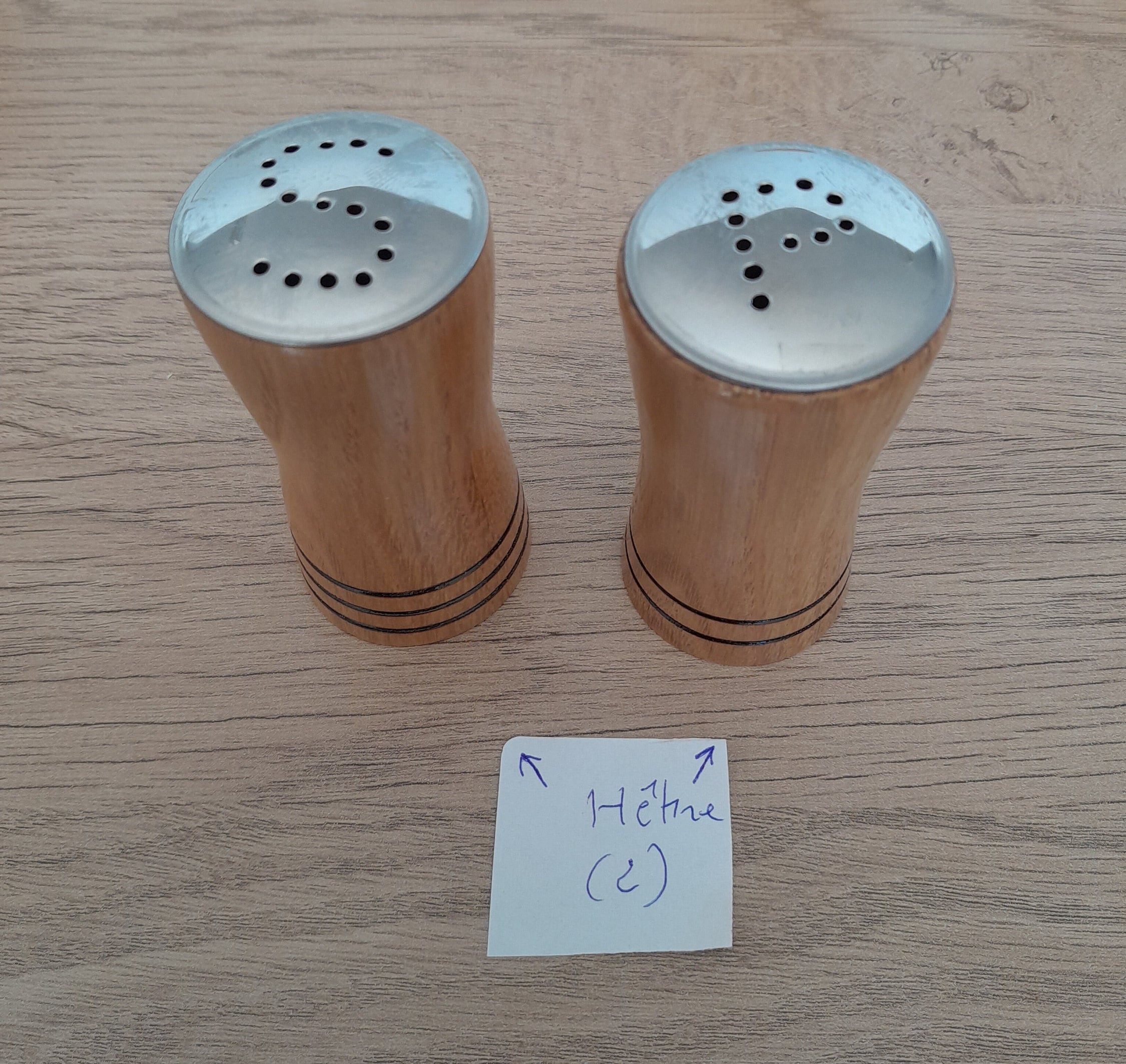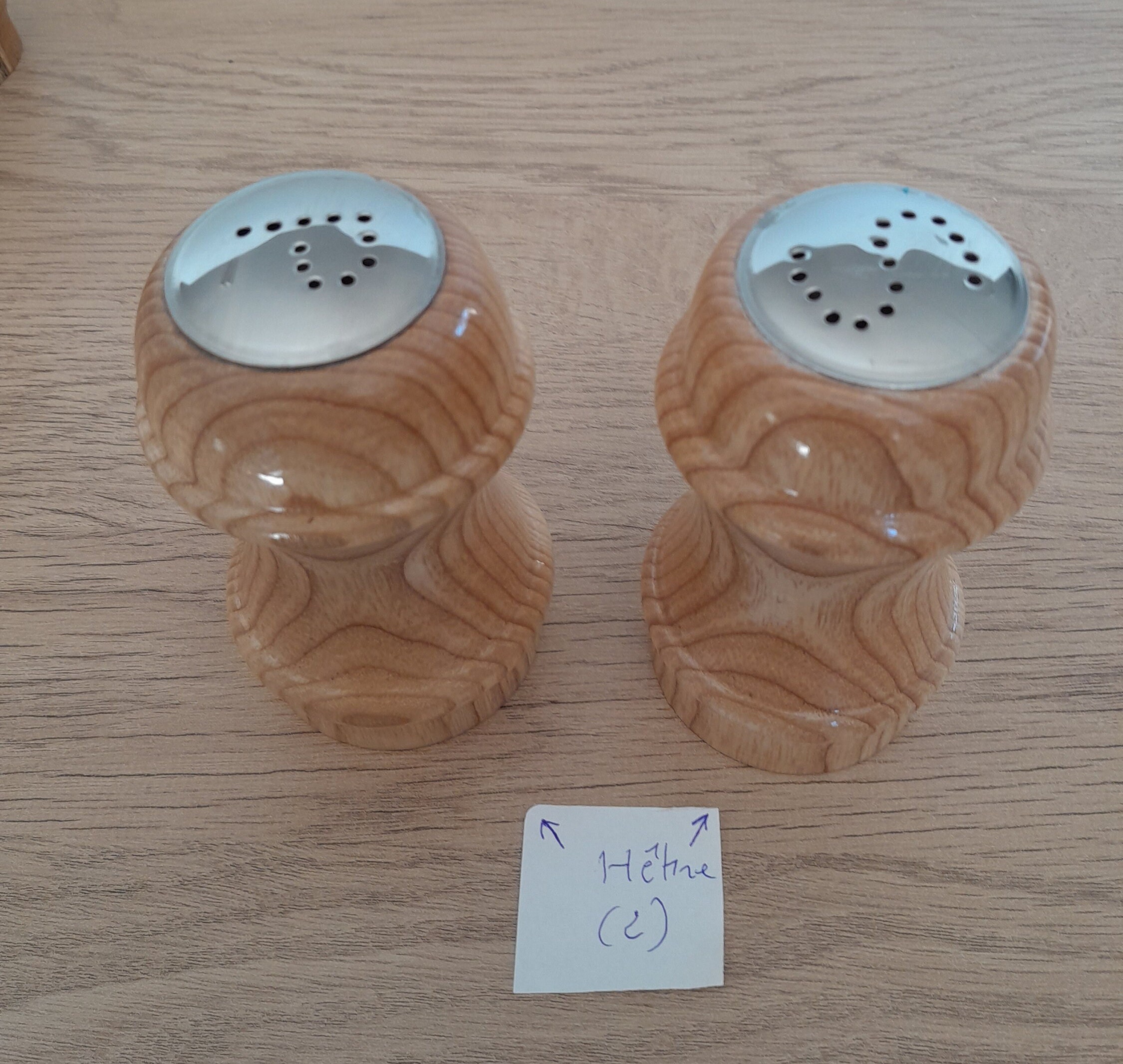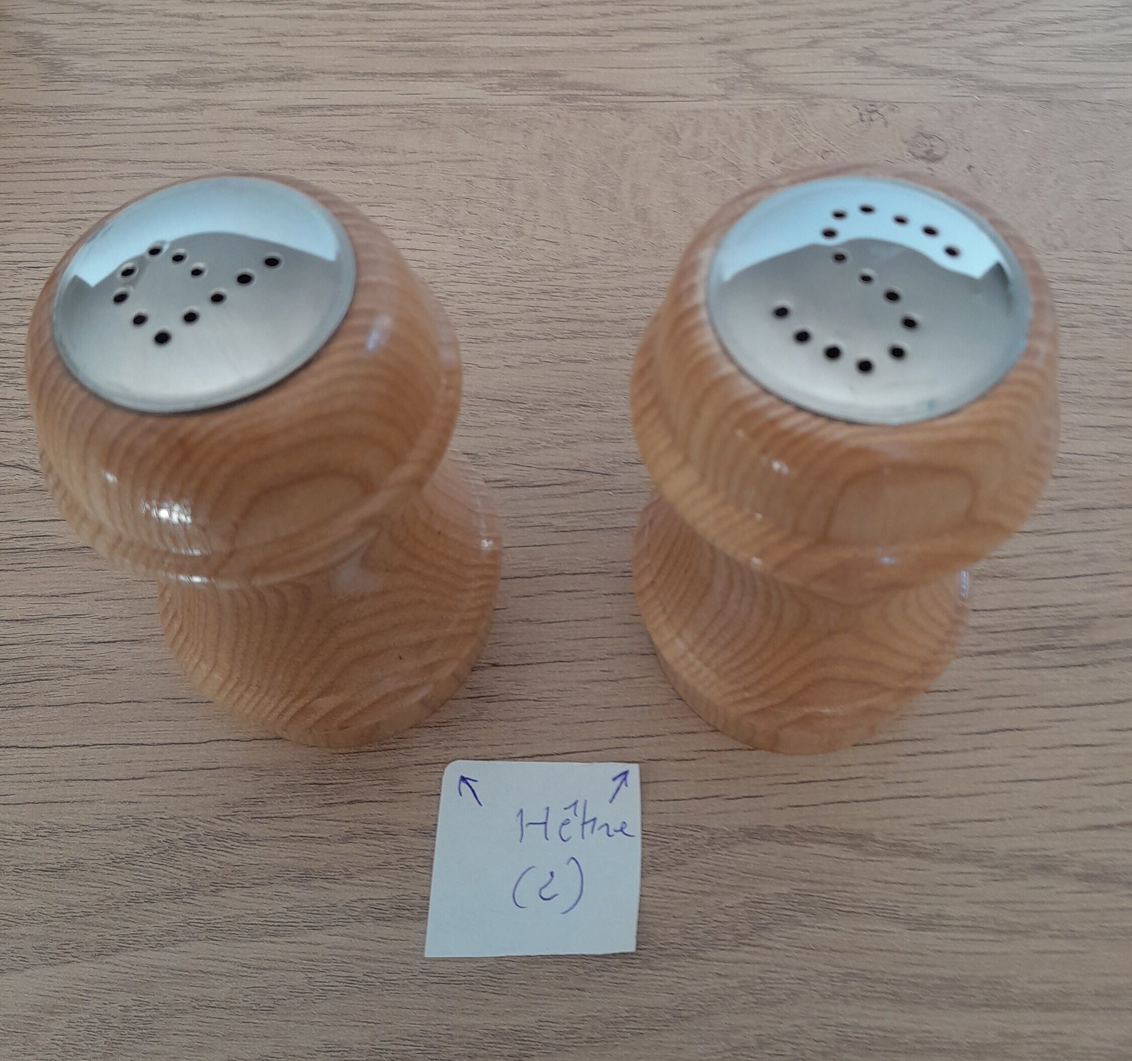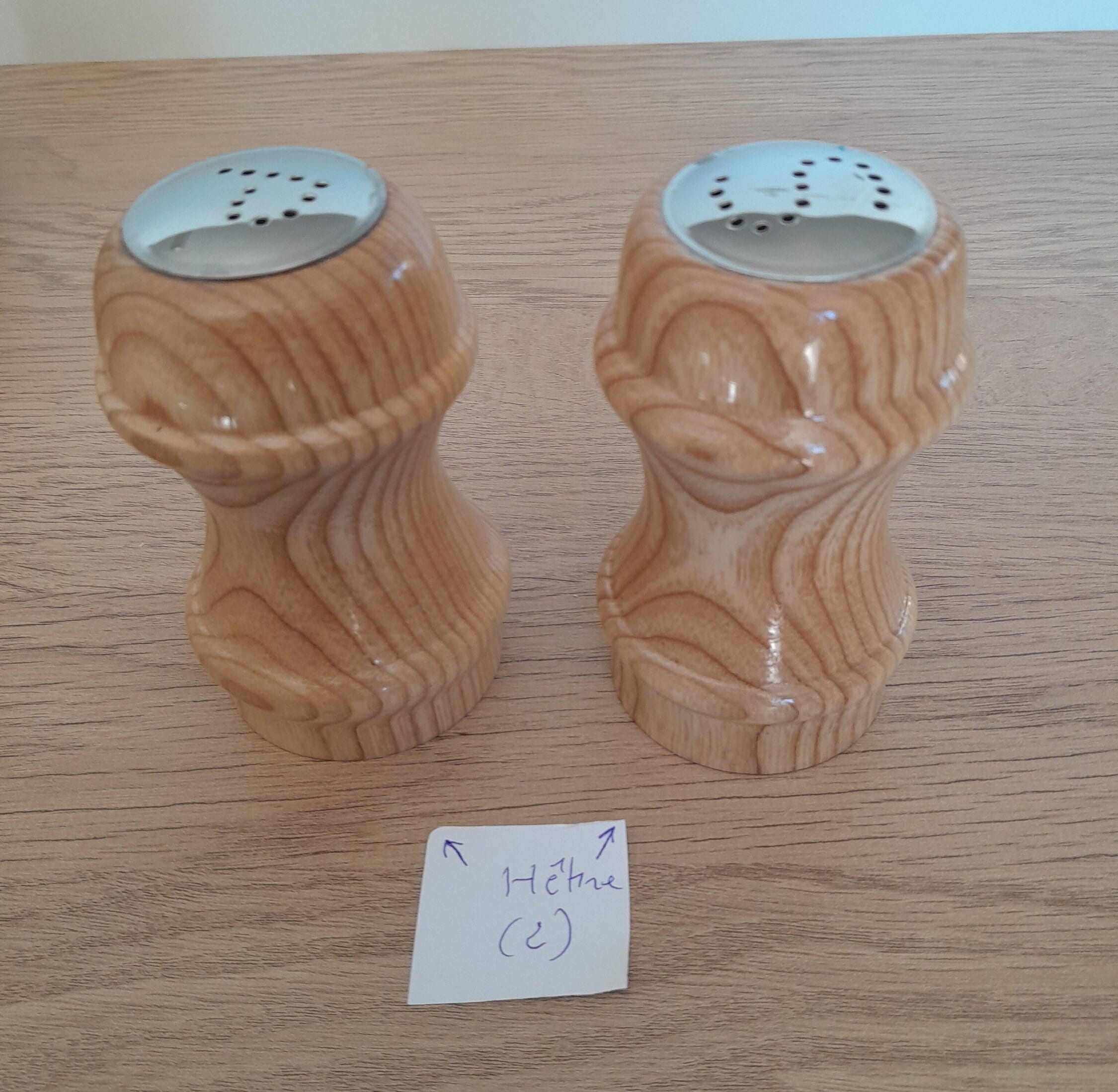 Salt and pepper shaker duo made from heated beech or birch wood.