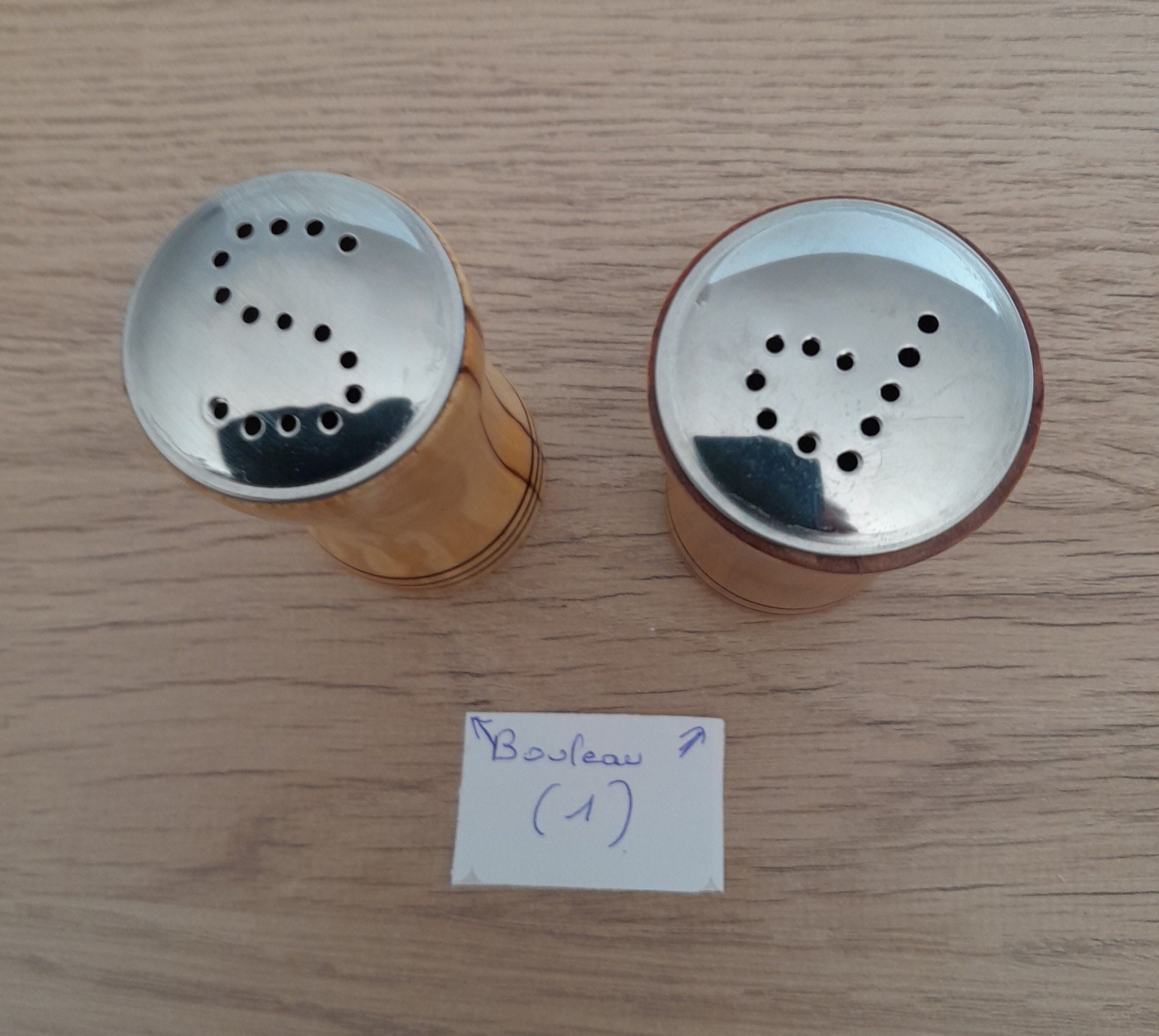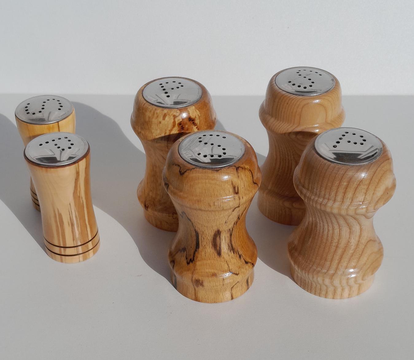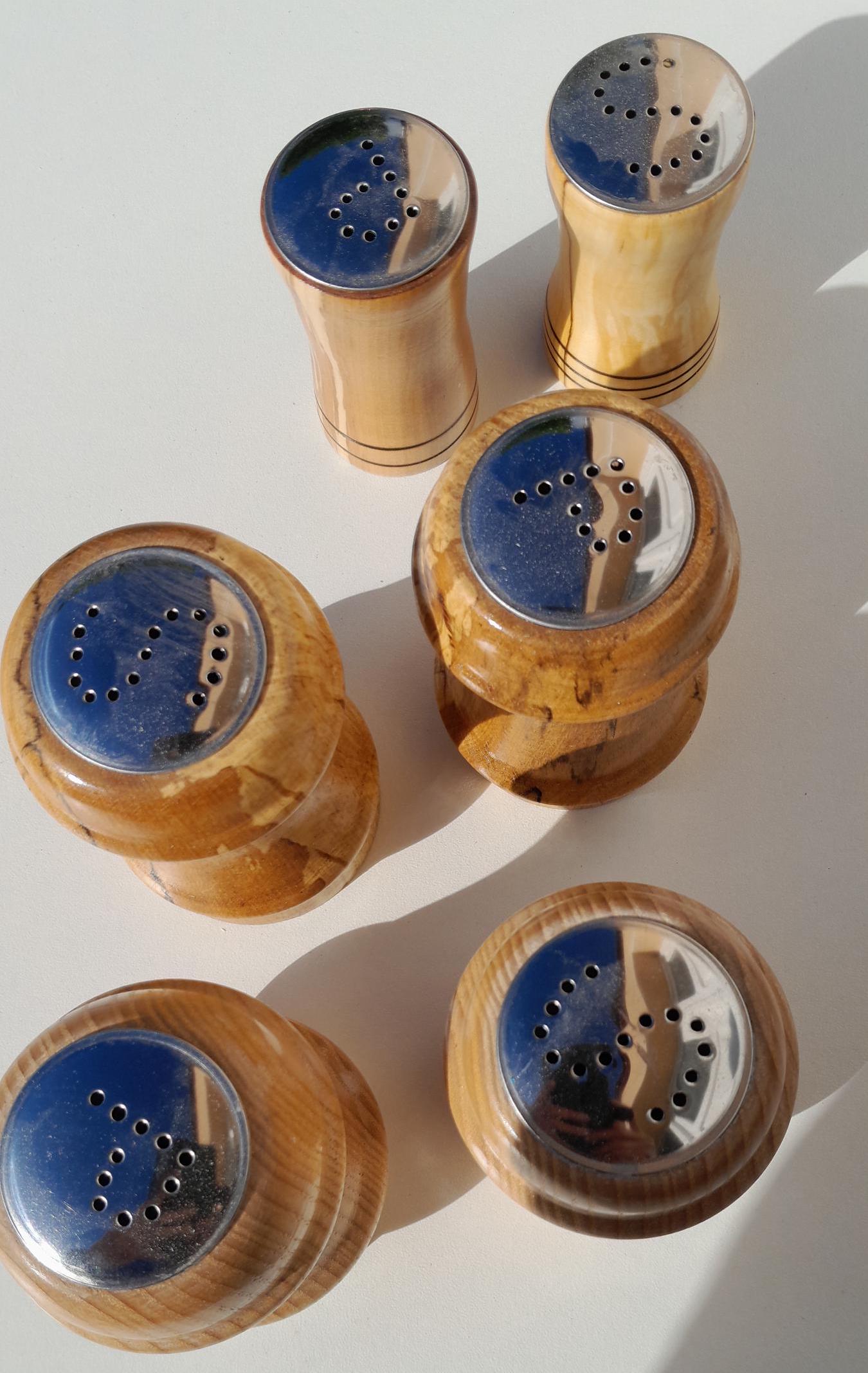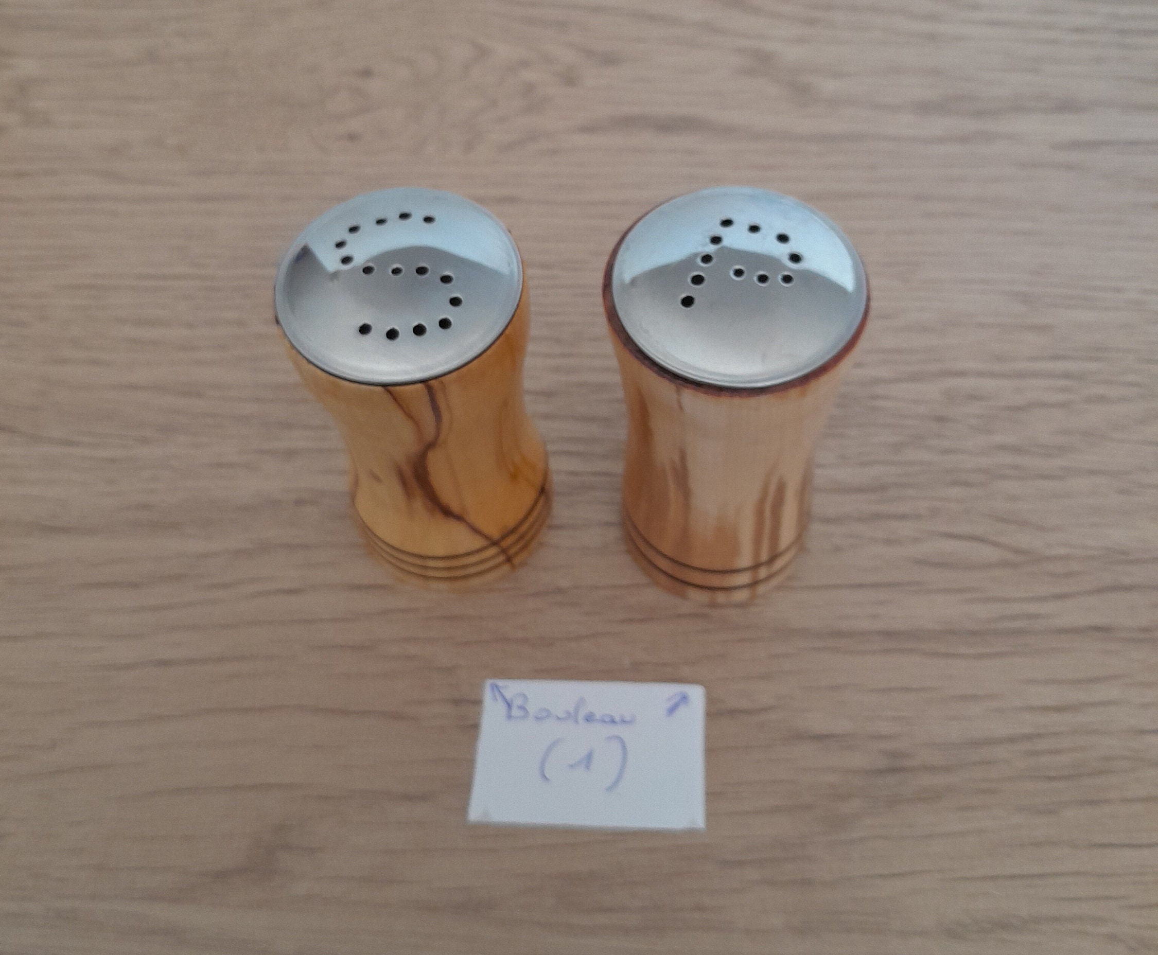 Salt and pepper shaker duo made from heated beech or birch wood.