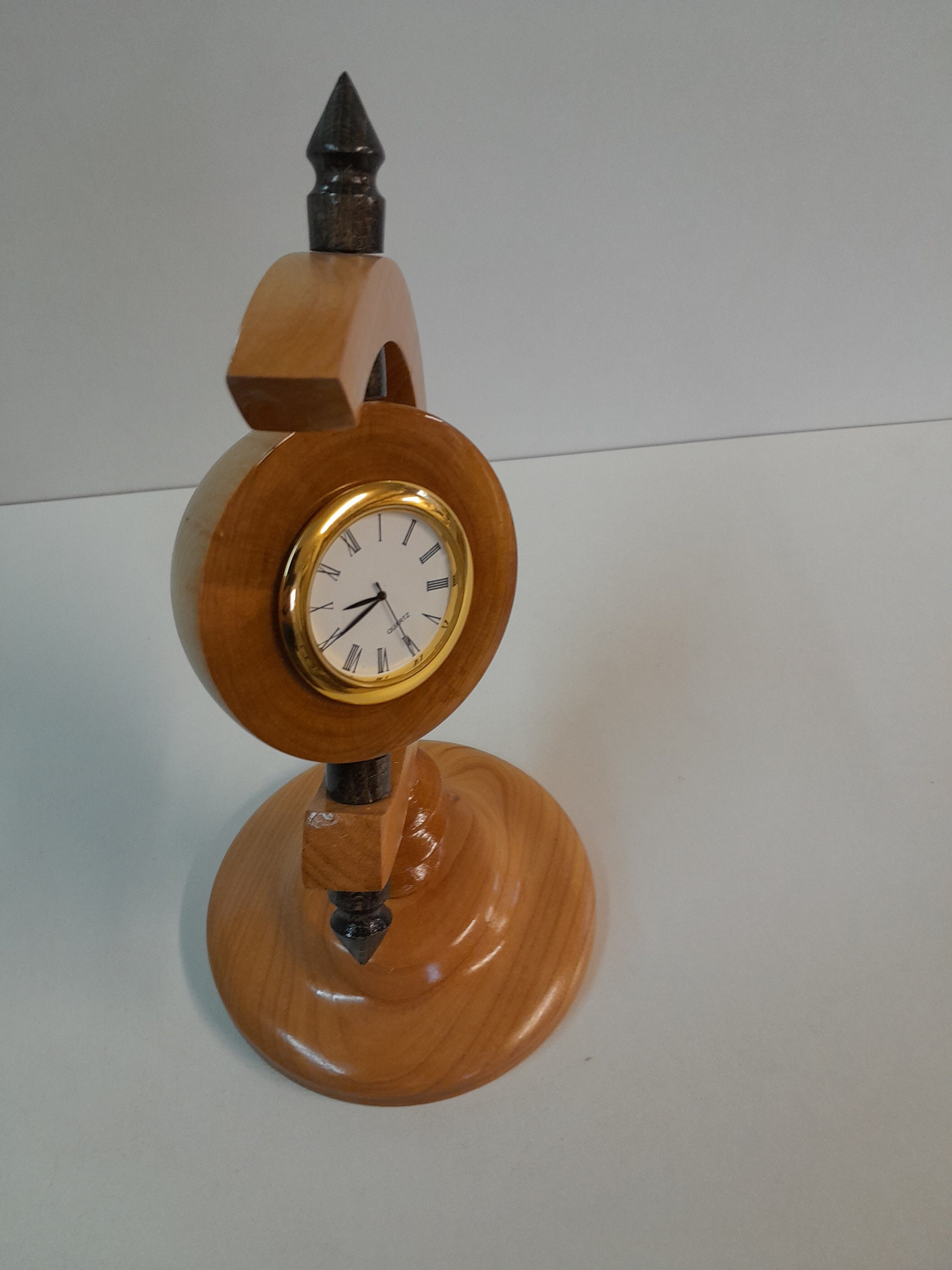 Small clock on cherry wood, quartz mechanism crowned with a 24 carat gold-plated metal casing, Roman numerals, height 22.5 cm, diameter 12 cm