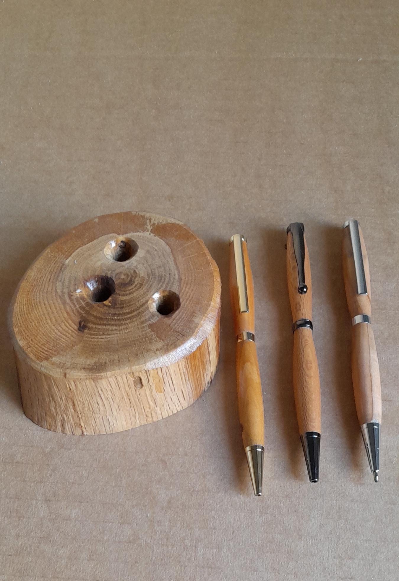 Wooden disc support with its three classic range pens, refillable and retractable, 1 gilded broom wood, 1 bronze plane tree wood, 1 chrome heated beech wood.