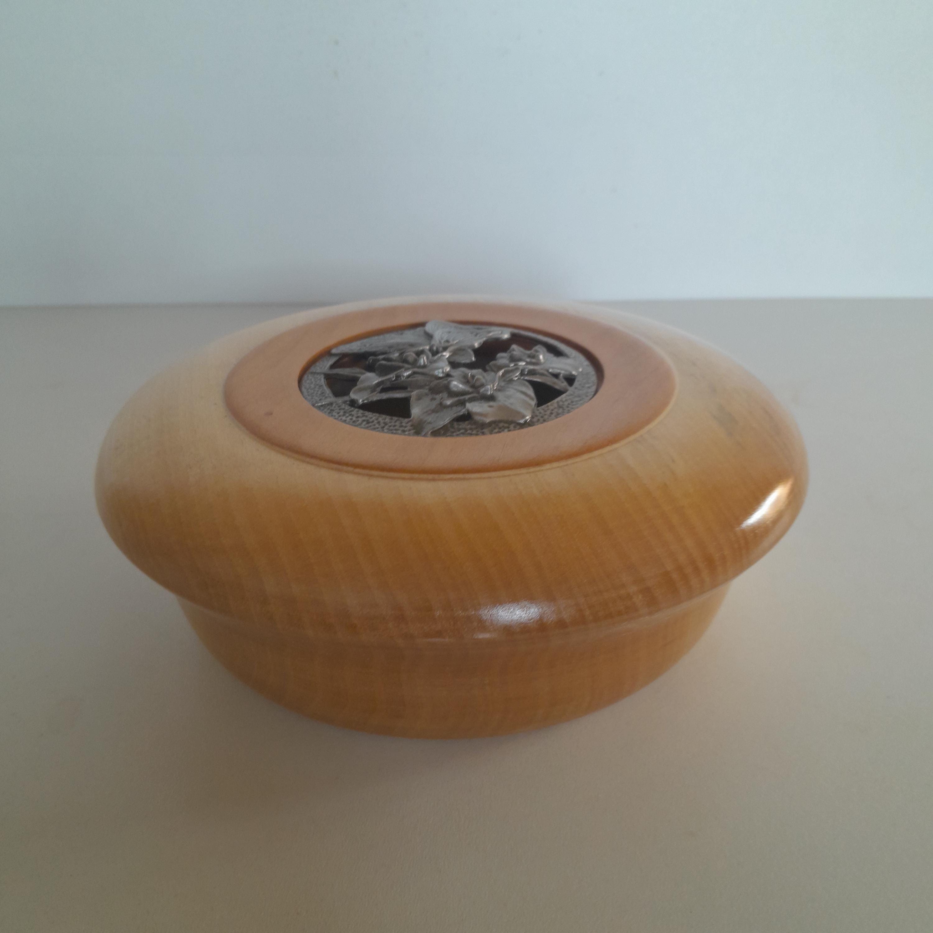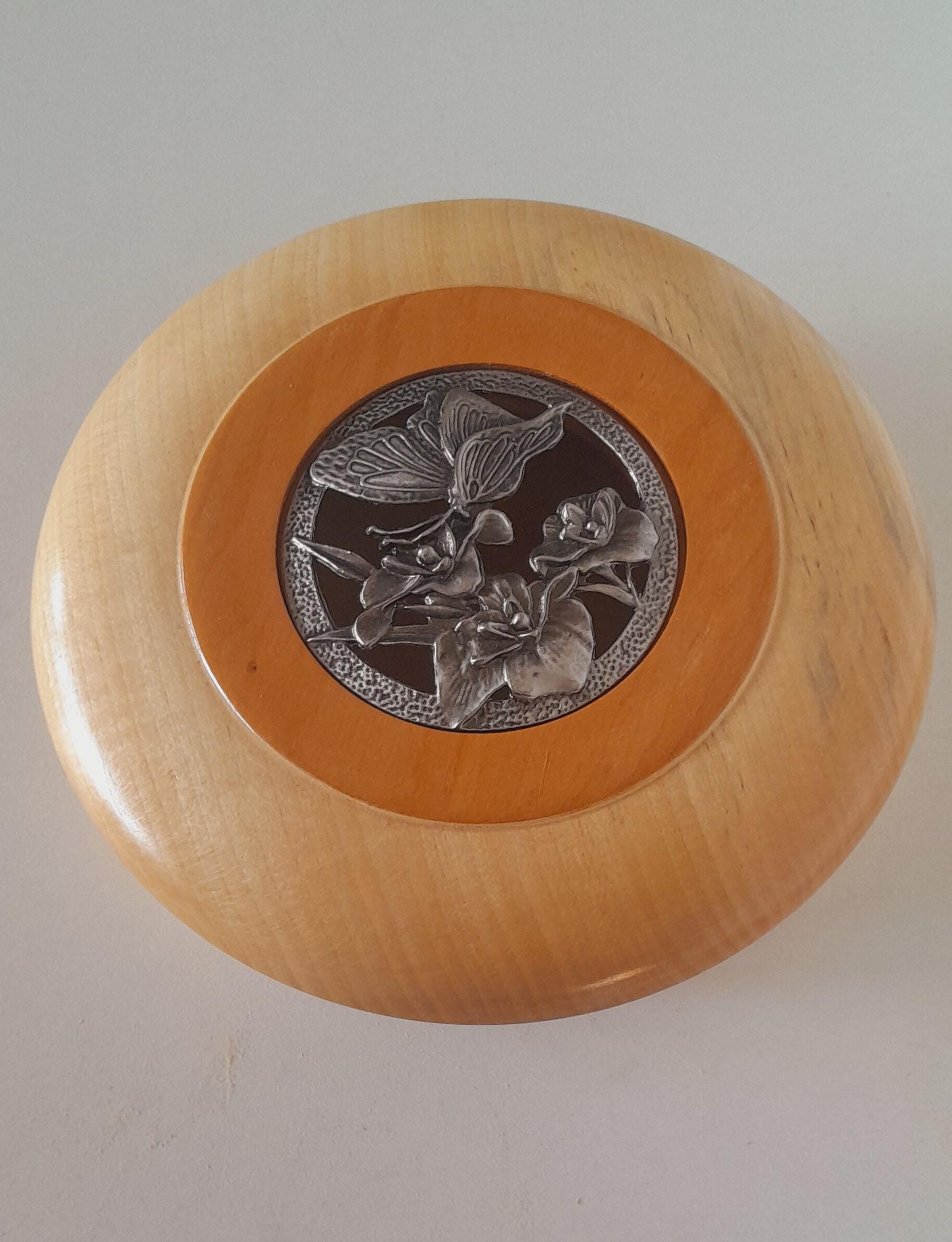 Linden wood bowl with cherry wood top, tin lid with butterfly decoration.